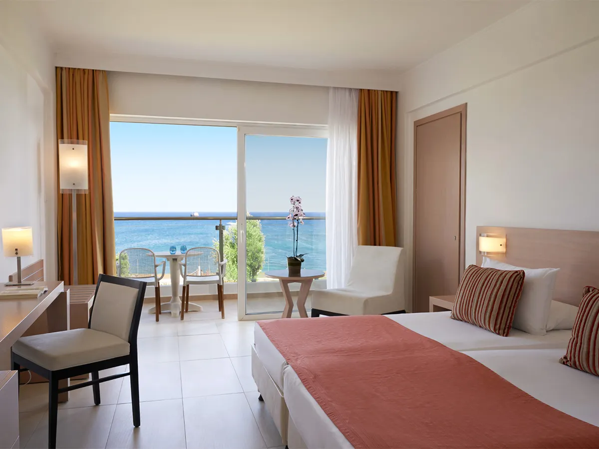 - Tweepersoonskamer (DZM, DZS, ca. 18-20 m²), airconditioning, koelkast, tv, telefoon, WiFi. Bad, toilet, haardroger. Balkon/terras, zeezicht. Max. 3V