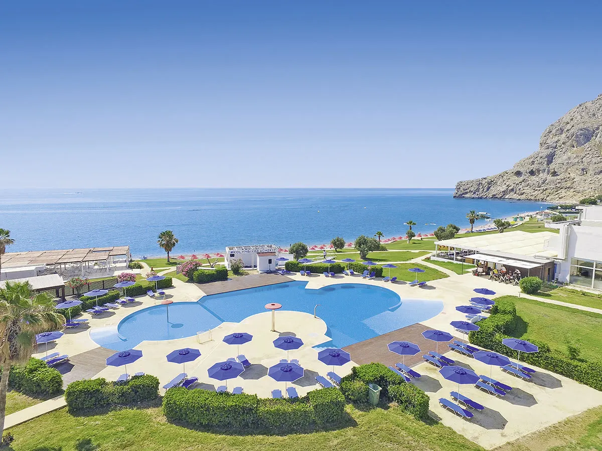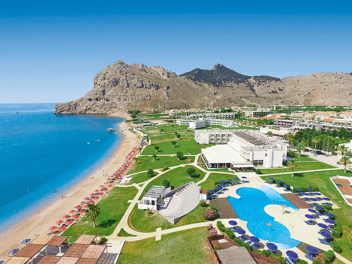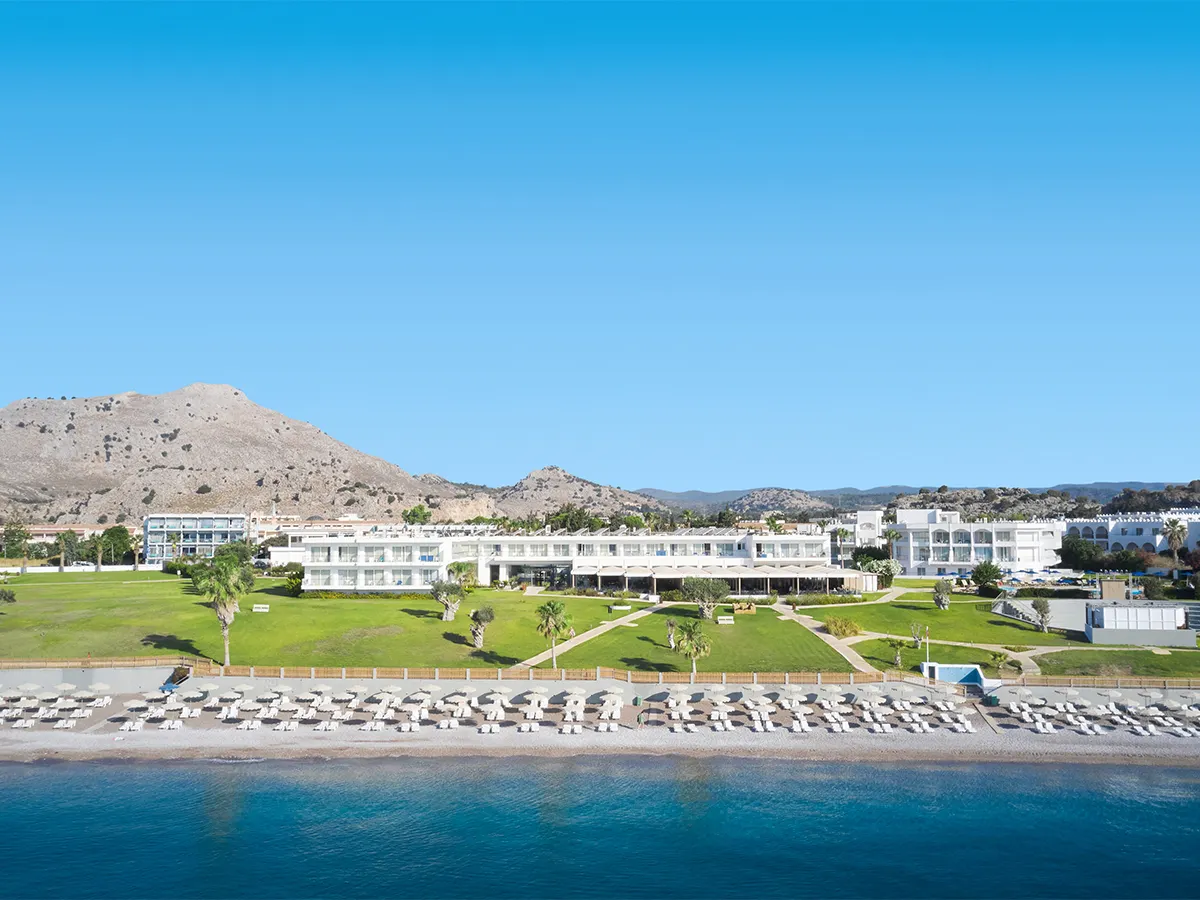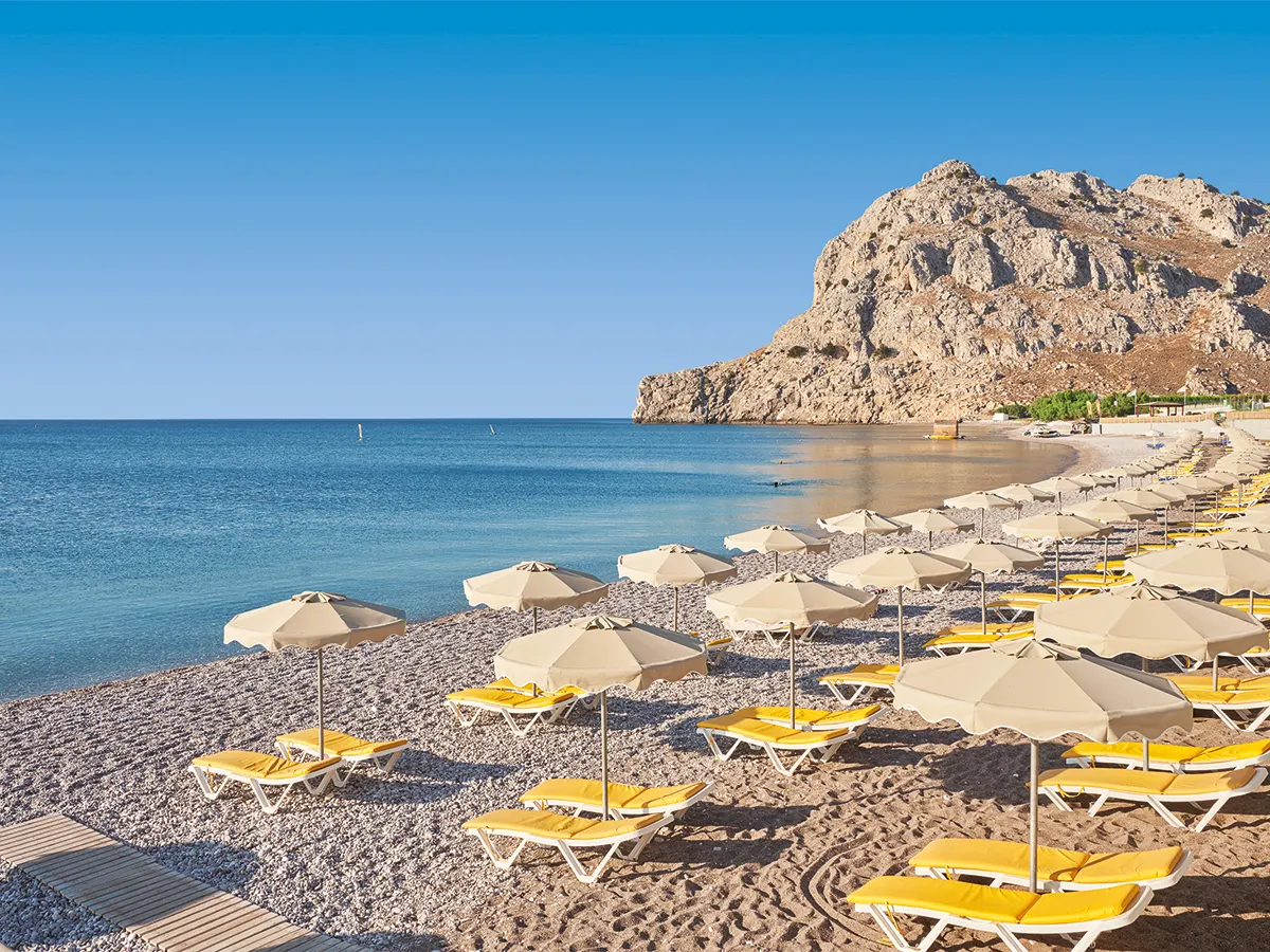 Puur badplezier! Geniet van ontspannen stranddagen op het eigen lange strand van Kolymbia met kristalhelder water - ideaal voor het hele gezin onder de Griekse zon.
