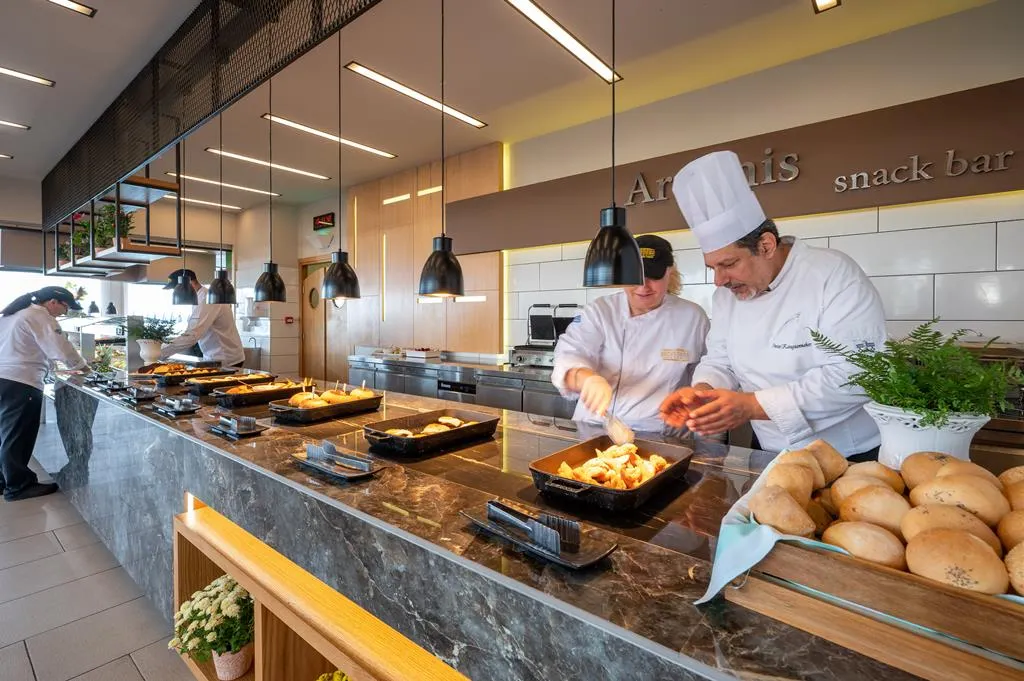 - 3 buffetrestaurants: Minos (Internationaal en lokale keuken), Dedalos (Internationaal en lokale keuken), Artemis All Day Street Food (Internationaal) en Dimitra Golden Hops Beer House (Italiaans en fastfood), open: mei t/m oktober