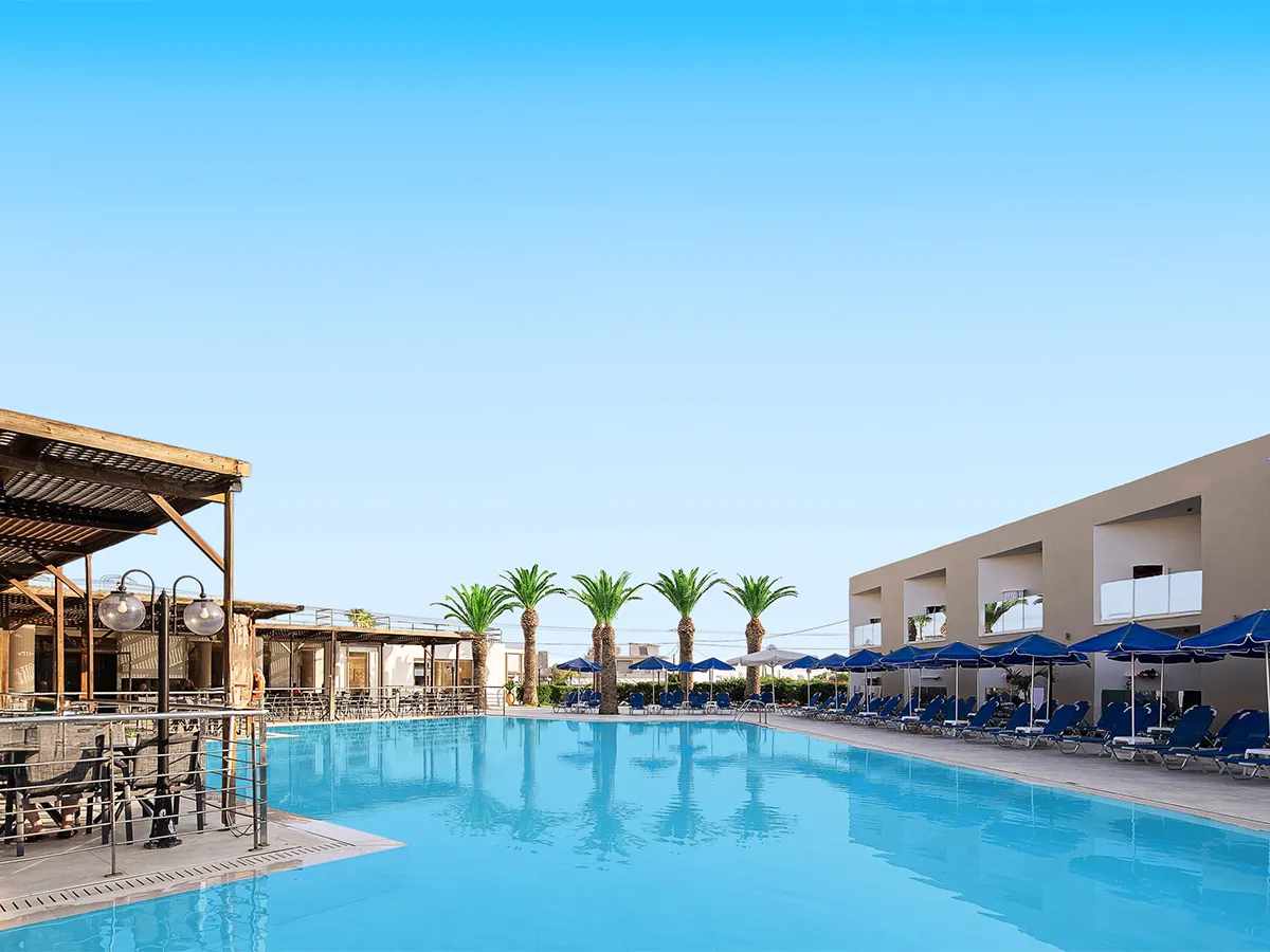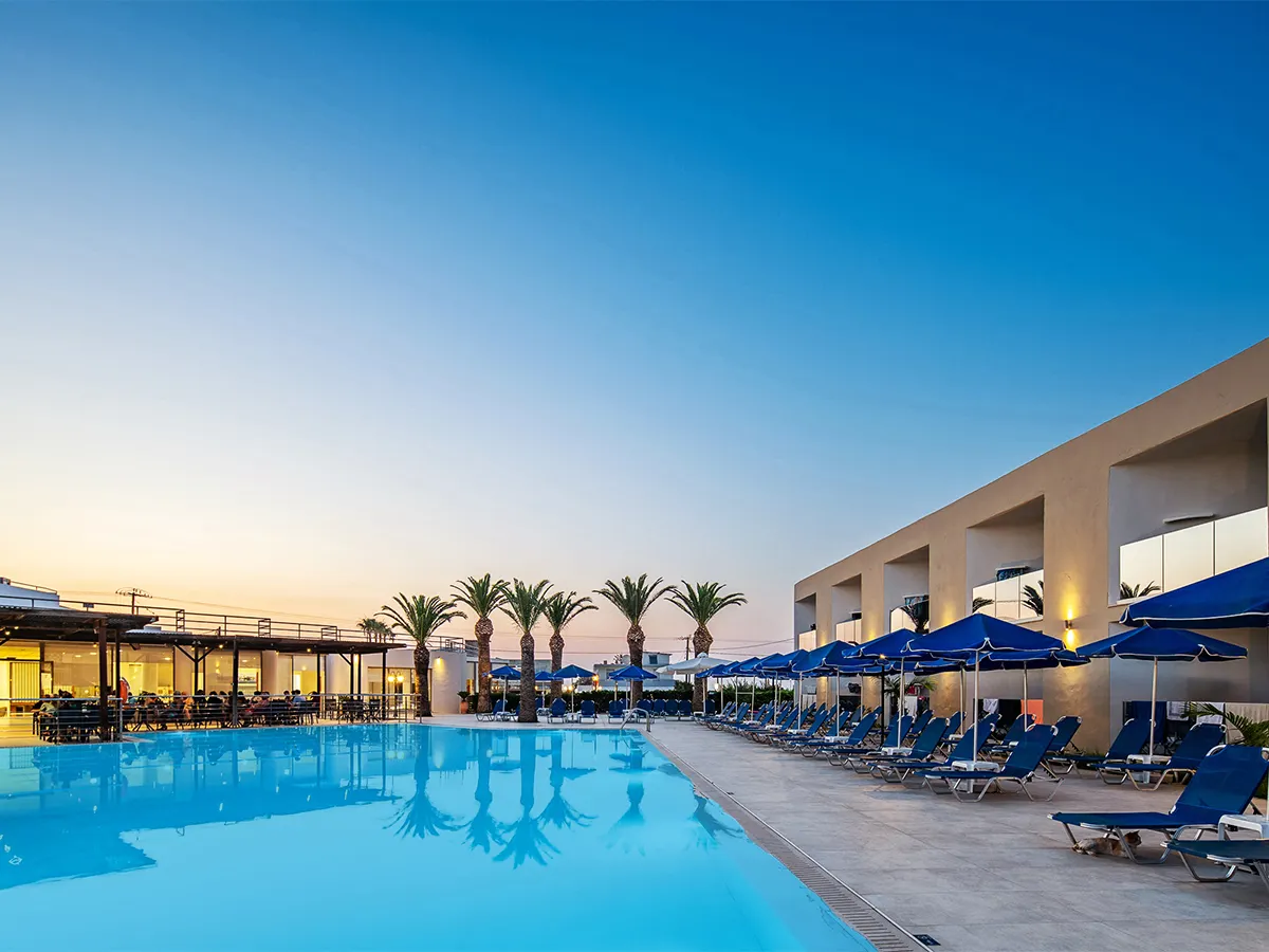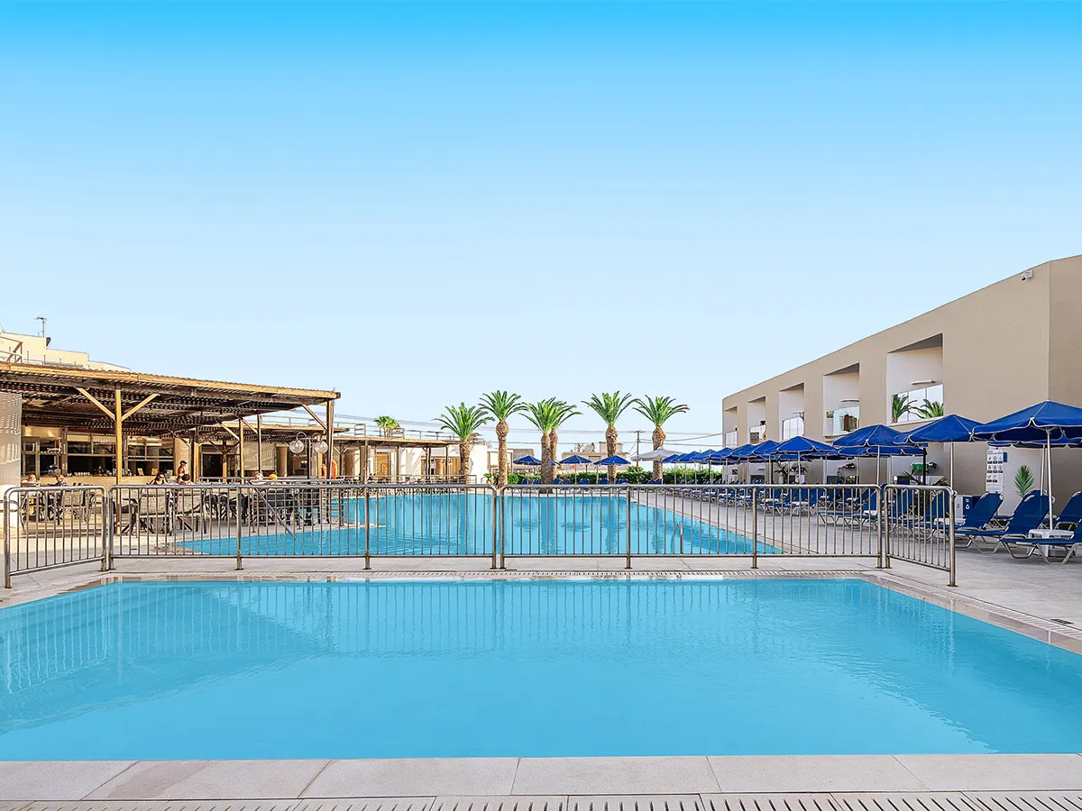 - Dit smaakvol ingerichte hotel biedt een buitengedeelte met 1 zoetwaterzwembad met zonneterras, ligbedden en parasols (tegen betaling op het strand). Receptie, lounge, WiFi, restaurant met airconditioning met terras en bar. Gratis parkeerplaats. 3 sterren, 137 kamers, 2 verdiepingen.