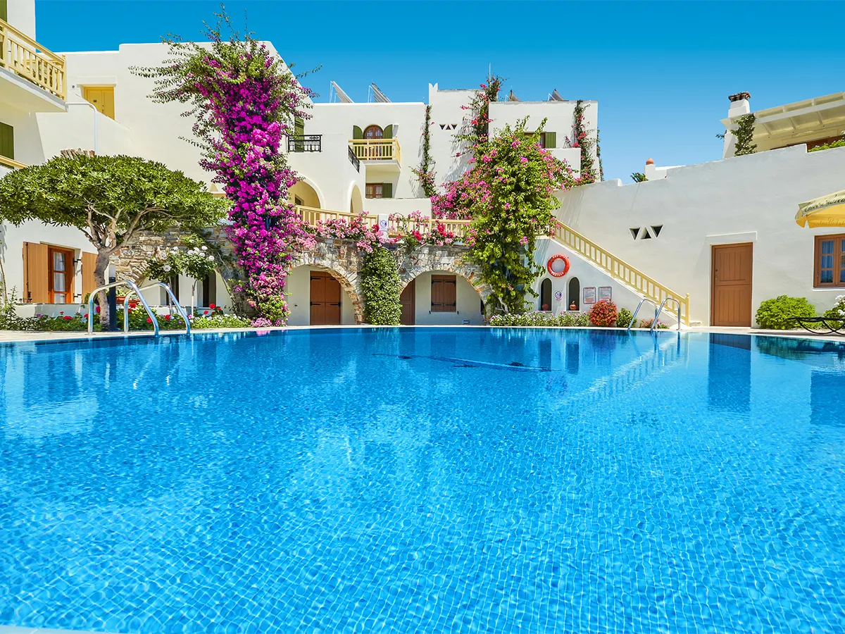- Familiehotel in Cycladische architectuur met zwembad, ligbedden, parasols. Receptie, WiFi (incl.), tv hoek, bar, ontbijtzaal. Landscat.: 3 sterren, 31 eenheden, 2 verdiepingen.