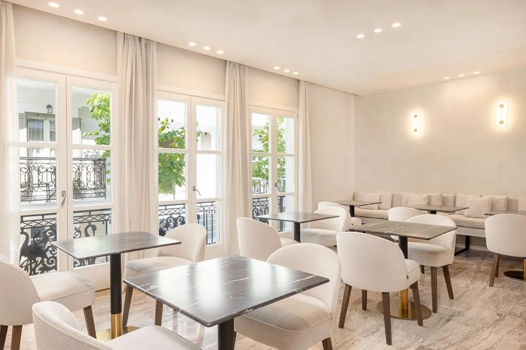 De receptie, ontbijtruimte, spa en gym bevinden zich aan de overkant in het gebouw van Theorem