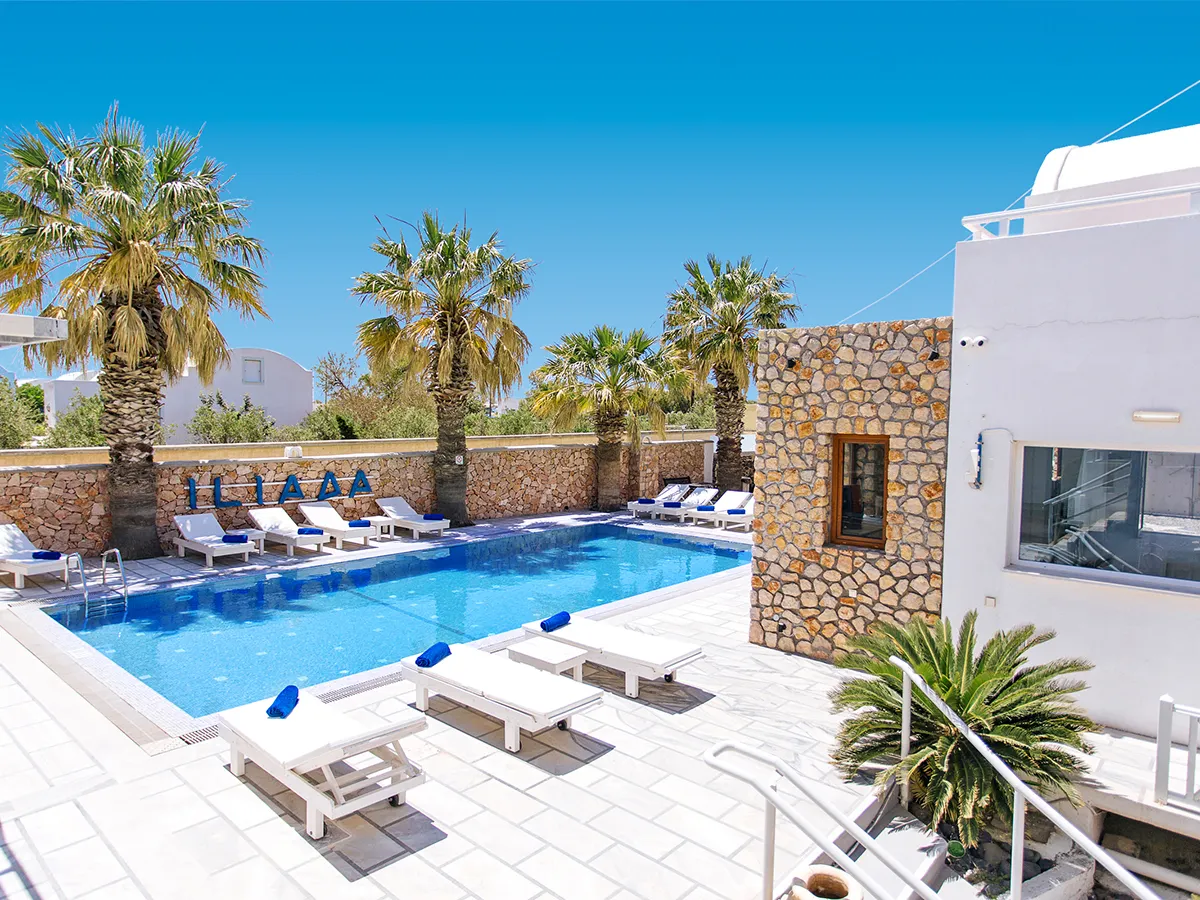 Smaakvol ingericht hotel in Cycladische stijl. Complex met zwembad, jacuzzi en zonneterras. Hotellobby, receptie (specifieke tijden bezet) en zithoeken. Wifi en badhanddoeken inclusief. Landcategorie: 4 sterren, 32 wooneenheden op 2 verdiepingen.
