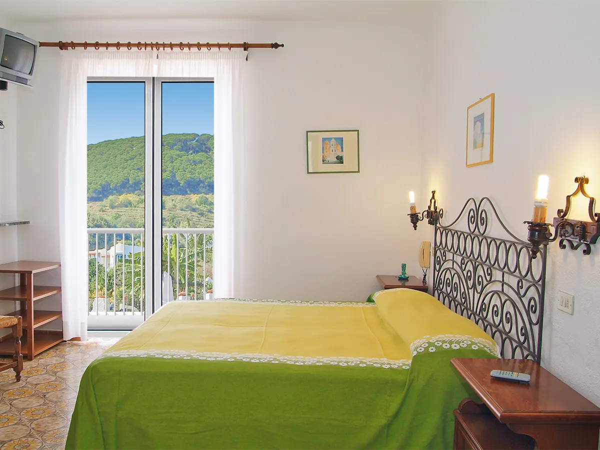- Tweepersoonskamer (DJ, ca. 12 m²), airconditioning, tv. Bad/douche, toilet, haardroger. Balkon/terras. Max. 3V