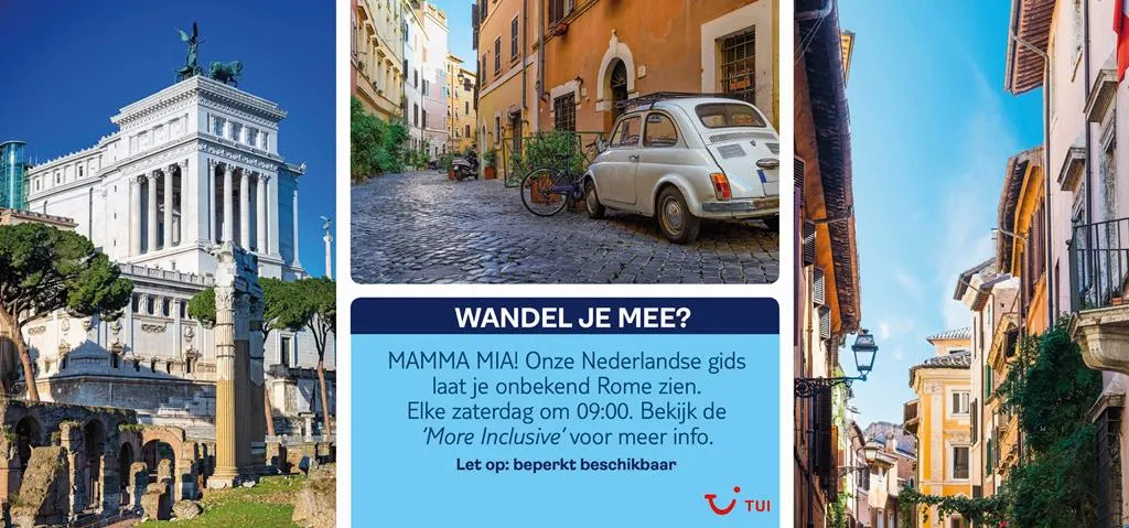 Wie op zaterdag met TUI in Rome is, krijgt een wandeling door een stukje onbekend Rome. TUI trakteert! De wandeling begint elke zaterdag om 09.00 uur vanaf het Largo di Torre Argentina richting de gezellige wijk Trastevere. Onderweg hoor je de prachtigste verhalen over Roma’s geschiedenis. En dan over de wijken en plekjes die alleen de Romeinen kennen. Als je je stedentrip naar Rome boekt, krijg je bij stap 2 de mogelijkheid om de Nederlandstalige wandeltour te boeken. Er zijn maar een beperkt aantal plaatsen beschikbaar. Krijg je tijdens het boeken geen optie om de tour te selecteren, dan zit deze helaas vol.
