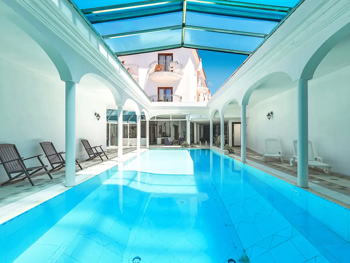 - Gezellig vakantiehotel in landtypische stijl. Hotellobby met receptie, WiFi, ontbijtruimte, bar, binnenbad (ca. 15.05.-15.10.). Strandlakens (tegen betaling), terrassen. 4 sterren, 33 wooneenheden. 2 verdiepingen, lift.