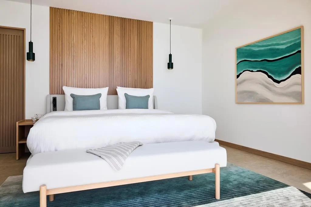 een gecombineerde slaap-/woonkamer gescheiden door 2 treden • zeezijde • met beperkte zeezicht door de vegetatie