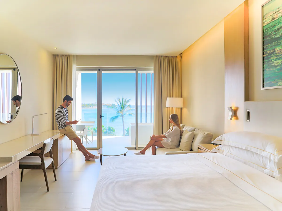 - Juniorsuite (JS, ca. 46 m²), airconditioning, minibar (dagelijks aangevuld), WiFi, tv, telefoon en kluis. Bad of douche, toilet, badjassen, slippers en haardroger. Balkon of terras met hydromassagebad. Naar keuze te boeken met zeezicht (JSM). Max. 3V<br>Ook voor alleengebruik (JSE) te boeken