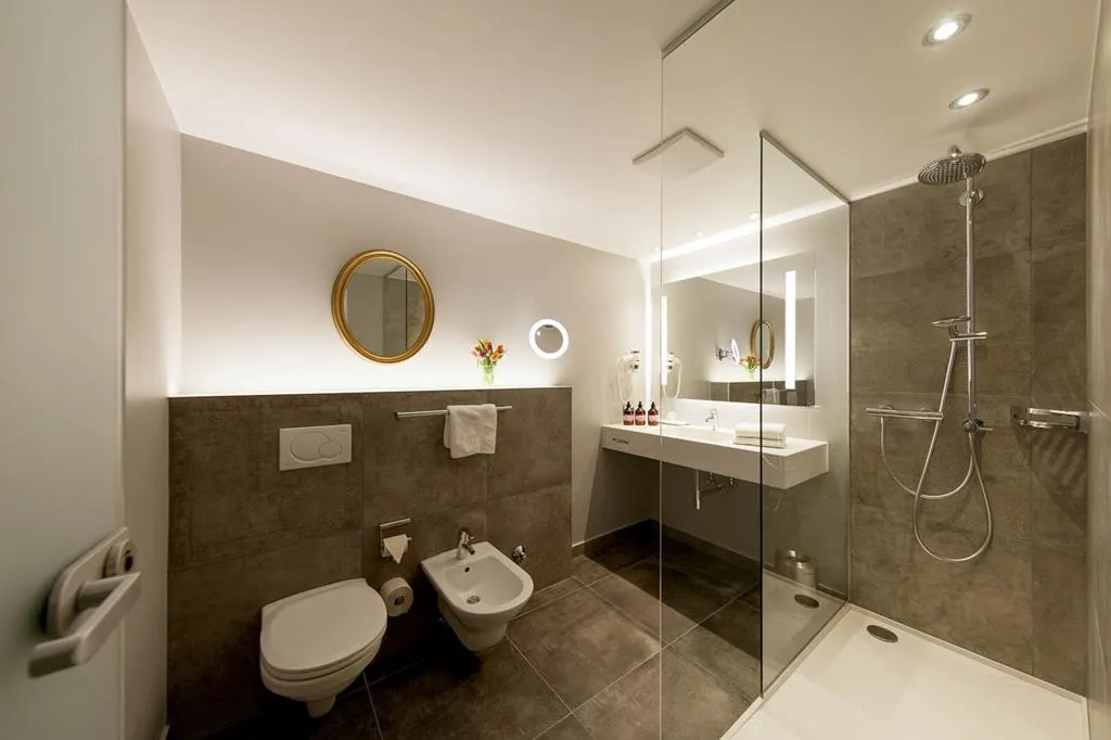 badkamer met bad of douche, haardroger, toiletartikelen en toilet