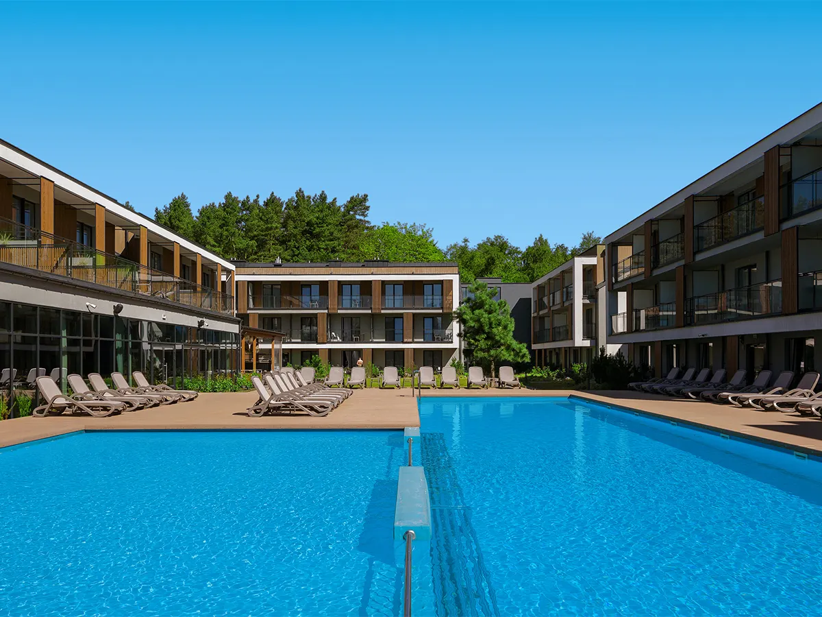 - Receptie, lobby, eetzaal, à-la-carte-restaurant, bar, café met buitenterras, buitenzwembad met ligstoelen en parasols (28.06.-07.09.26). 3,5 sterren, 165 kamers, lift.