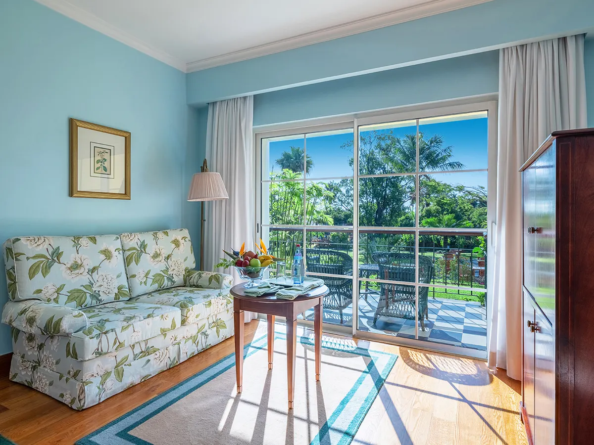 - Juniorsuites (JS, ca. 48 m²), in het herenhuis (zonder lift — toegang via trappen), airconditioning, minibar, koffie-/theezetapparaat, tv, telefoon, WiFi, USB-aansluiting, kluis. Bad, inloopdouche, toilet, haardroger. Balkon, tuinzicht. Max. 3V