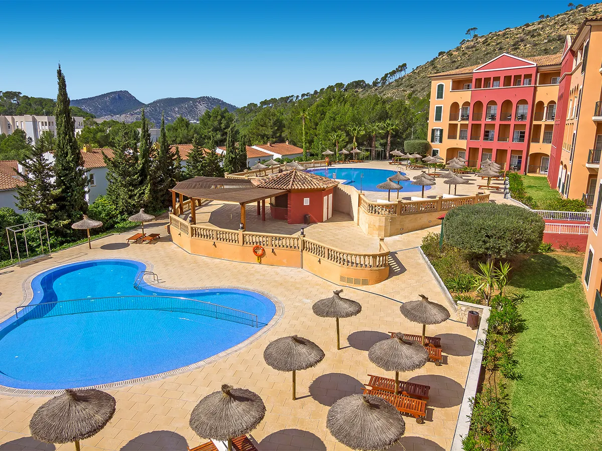 - Comfortabel, smaakvol uitgerust en in Mallorcaanse villastijl gebouwd deluxe-hotel met hoofdgebouw en meerdere woongebouwen. Ruime tuin, 2 zwembaden met zonneterras, 2 jacuzzi's, ligbedden, parasols (badhanddoeken tegen borg), pool-/snackbar met zitterras. Elegante ontvangsthal, receptie, WiFi (inclusief), zithoek, bar met terras. Restaurant op de 1e verdieping met prachtig uitzicht over de baai. Landcategorie: 4 sterren, 151 kamers, 4 verdiepingen, 2 liften.