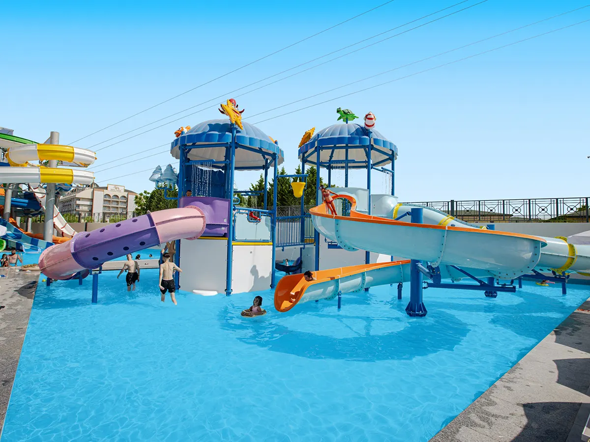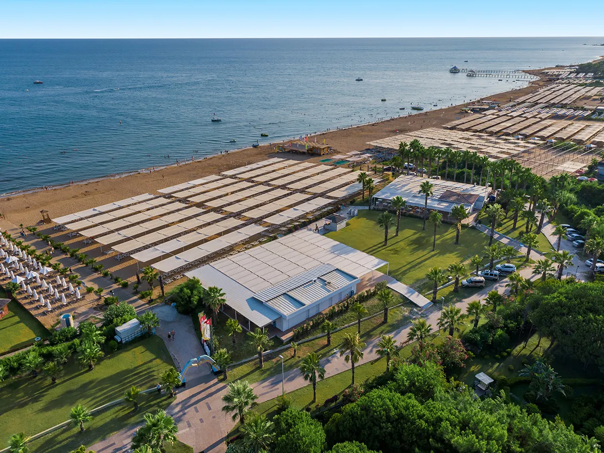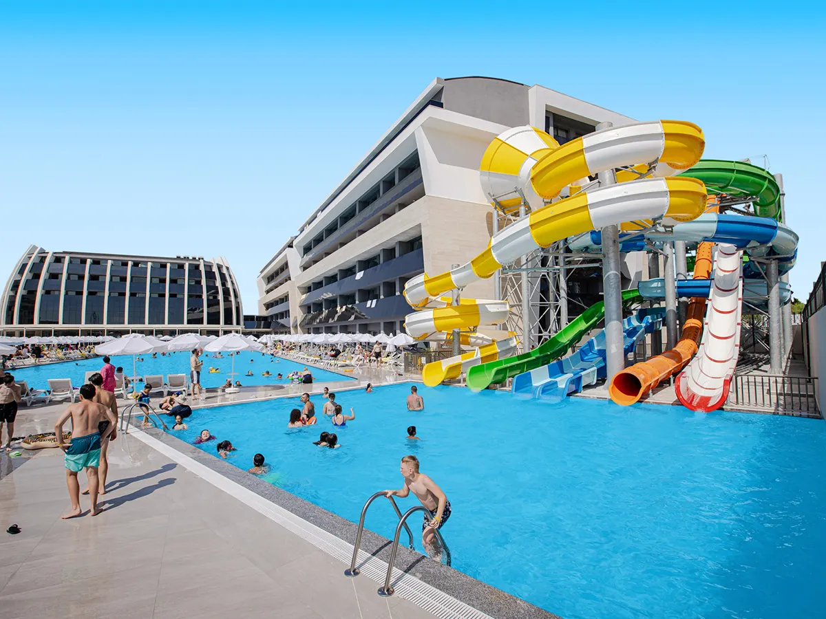 - Modern en ruime hotelcomplex op ca. 25.000 m² oppervlak met tuingedeelte, zwembad, waterglijbaan, ligbedden, kussens, parasols en snack-/poolbar. Uitnodigend hotellobby met receptie, lobbybar, buffetrestaurant, strandrestaurant, à-la-carte-restaurants (internationaal, Italiaans, vis; tegen betaling), bars, minimarkt, patisserie, discotheek. 5 sterren, 390 kamers, 7 verdiepingen, lift.