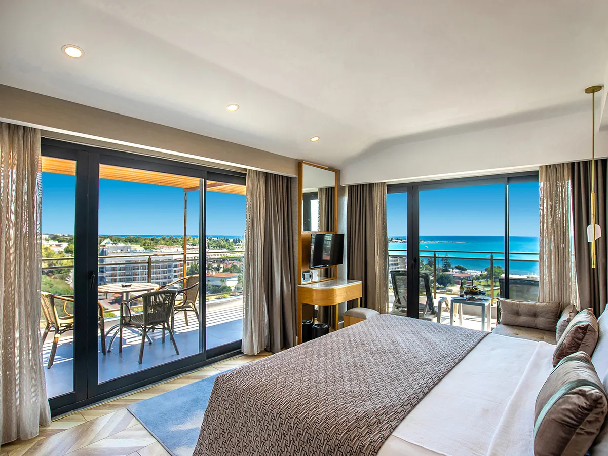 - Tweepersoonskamer (DSP, ca. 33 m²), airconditioning, minibar, telefoon, tv, wifi, kluis. Douche, toilet, haardroger. Terras, zeezicht. Max. 2V