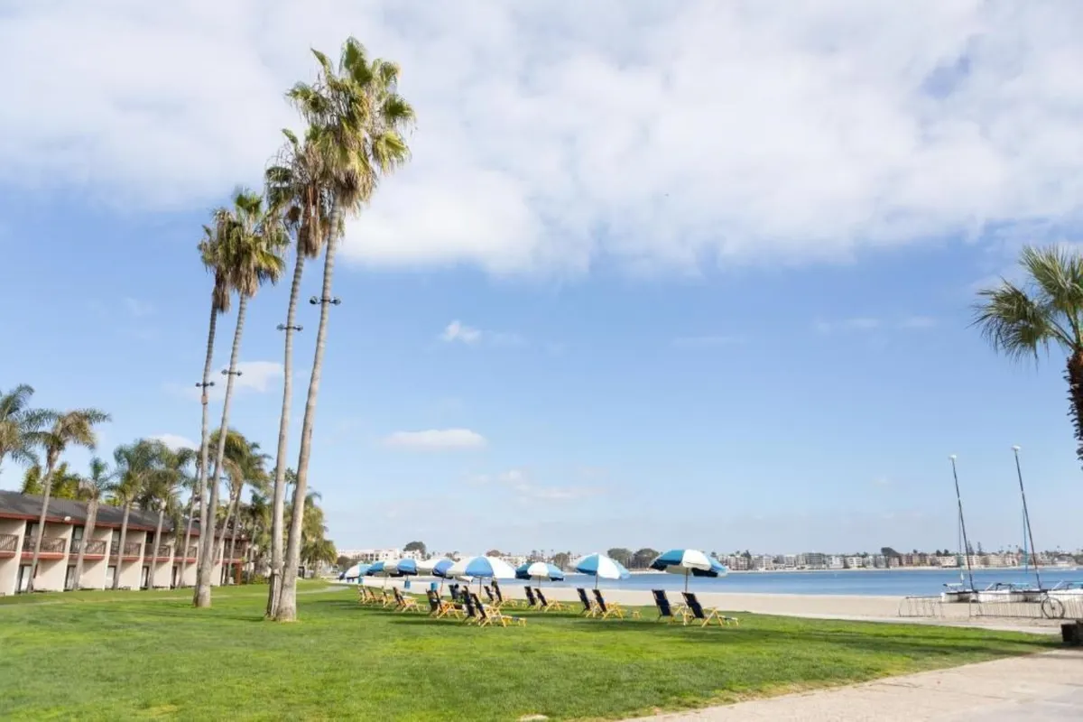 Mooie ligging aan baai (niet strand) van san diego. Grote kamers met voldoende faciliteiten. Het bezwaar hier is dat de hygiëne te wensen overlaat. Kamers niet schoon nog etensresten en tandenstokers van de vorige bewoners. E er hangt overal een typische geur. Zwembad zelf redelijk schoon en ook mooi mooie beplanting maar oude stoelen en tegels zwembad heel vies dus op blote voeten lopen geen optie. Dit hotel heeft dringend een update nodig. Maar ook met bestaande faciliteiten meer aandacht voor hygiëne en geen quick Fixes zoals het afplakken van gevels met plak plastic maar grondig onderhoud en renovatie. De stad zelf is 30 minuten verder. Het schijnt dat er gerenoveerde kamers zijn ik zou alleen mensen daar heen sturen nu voelt 38 dollar parkeergeld en resort fee beetje belachelijk in verhouding tot wat je krijgt. Mensen waren ook niet aardig bij ontvangst iets dat ik in meerdere recensies teruglees.